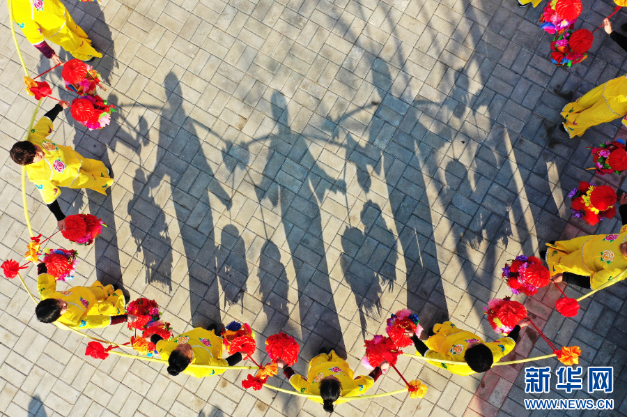 2020年12月27日,民间艺人在河南省平顶山市宝丰县张八桥镇姚店铺村表演经担舞(无人机照片)。