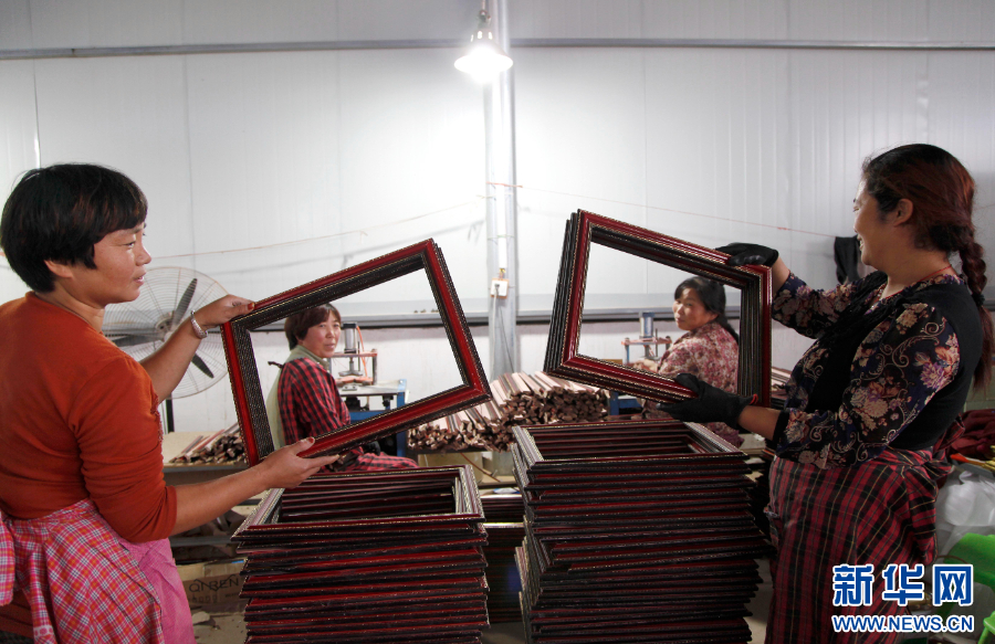 在河南省平顶山市宝丰县赵庄镇一家相框厂,女工在摆放制作好的相框。