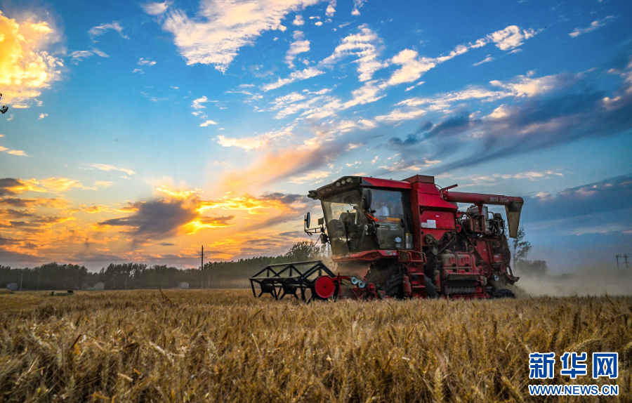 收割机在河南省商丘市夏邑县会亭镇良种繁育基地收获小麦。