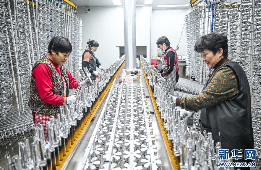 在河南省商丘市夏邑县会亭镇西街东村的一家打火机配件厂机壳镀膜车间,工人在查看产品质量。