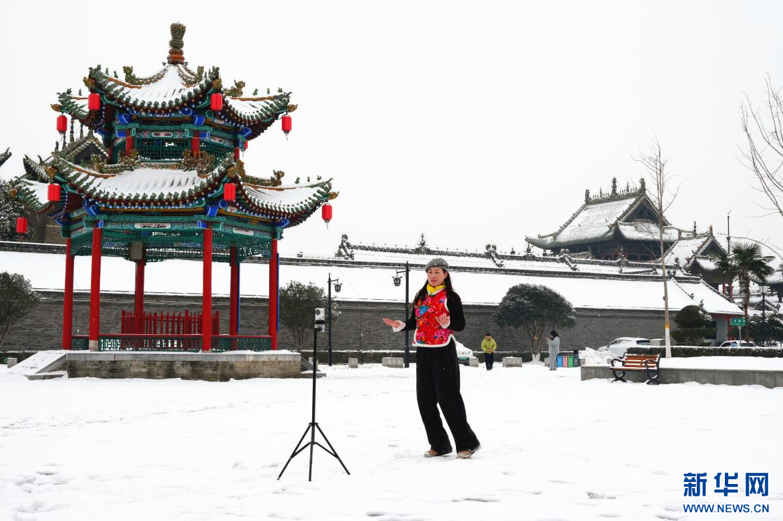 1月20日,在河南省南阳市社旗县,一名游客在雪景中直播。申鸿皓 摄