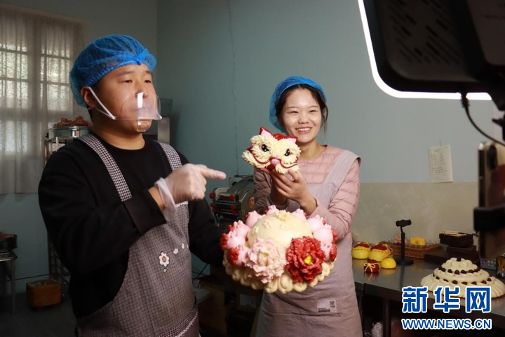 1月22日,在安阳市内黄县一家手工花馍坊内,手工艺人正在直播间销售花馍。(刘肖坤 摄)