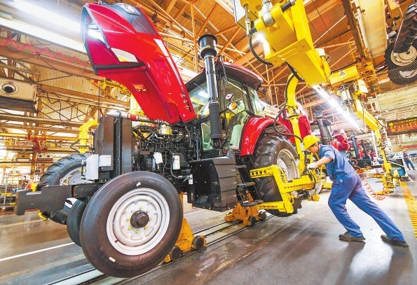 在位于洛阳市的中国一拖大拖公司总装生产线上,工人正在装配拖拉机。 张怡熙 刘嘉伟 摄