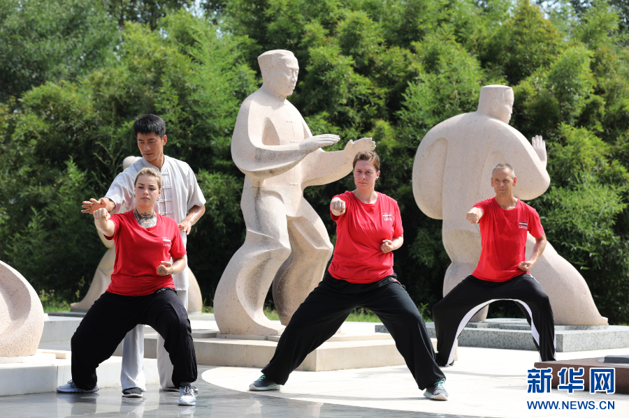 2025年8月16日,在河南省焦作市温县陈家沟,太极拳师郑赢全指导拉脱维亚学员练习太极拳。新华社发(徐宏星 摄)