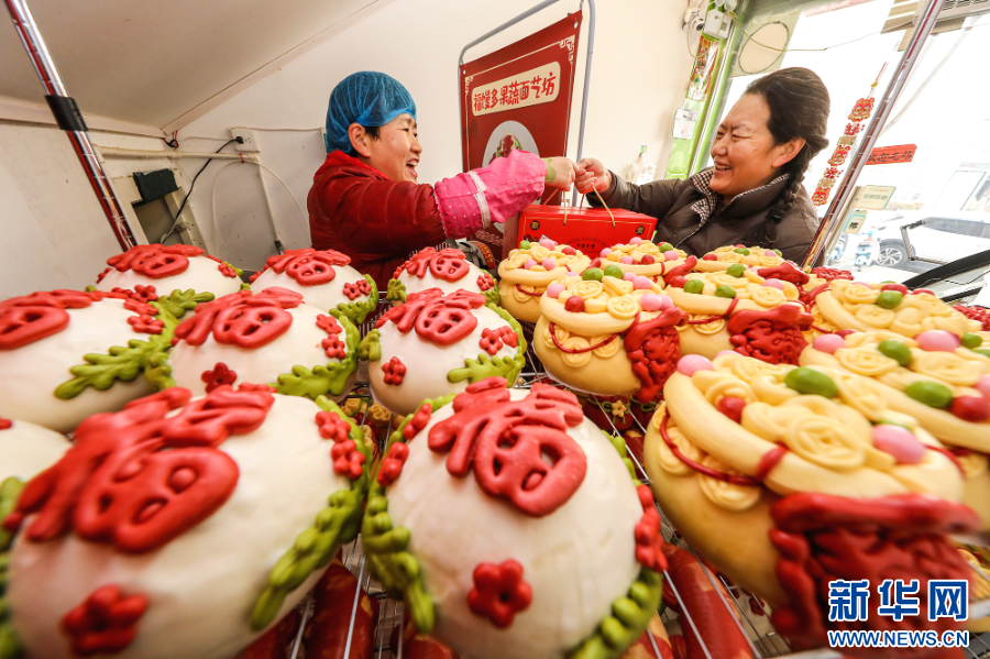 2025年1月22日,顾客在河南省商丘市睢阳区一家花馍店购买花馍。新华社发(李恒 摄)