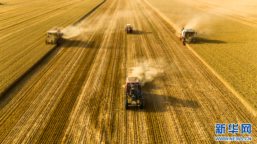 2025年6月4日,在河南省商丘市梁园区李庄镇潘堂村志诚种植农民专业合作社,农机手操作收割机、秸秆还田机、玉米精量播种机作业(无人机照片)。新华社发(李恒 摄)