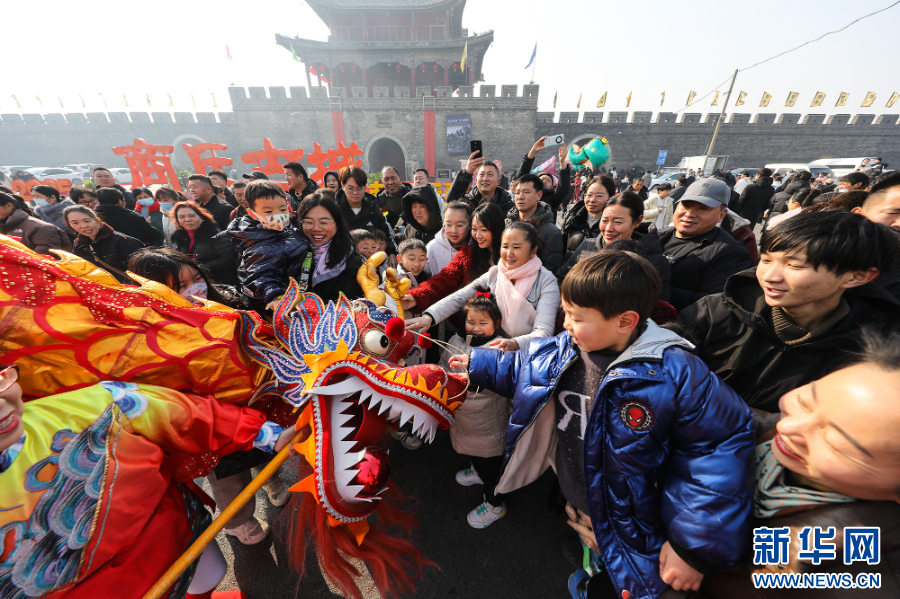 2025年1月29日,在河南商丘古城春节豫东民俗文化巡游活动现场,游客与民间舞龙队互动。当日是农历大年初一,各地群众参加特色民俗活动,过红火中国年。新华社发(李恒 摄)