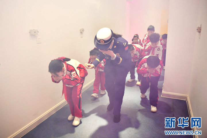3月27日,在河南省南阳市第十五小学科普教育基地,学生们正在进行消防安全逃生演练。方建峰 摄