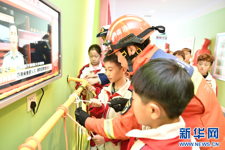 3月27日,在河南省南阳市第十五小学科普教育基地,学生们正在消防员的指导下学习逃生绳结打法。方建峰 摄