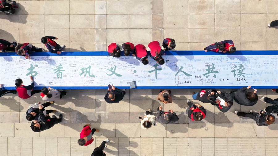 4月20日,市民在河南省郑州市巩义市“全民阅读活动周”暨公共图书馆服务宣传周主题活动现场的横幅上签名。(康泽 摄)