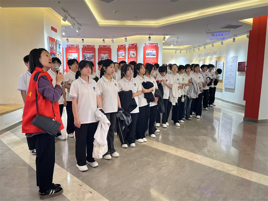4月20日,在河南省郑州市巩义市,志愿者带领青年读者参观市新时代文明实践中心。(康泽 摄)