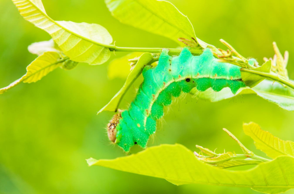 4月23日,在平顶山市鲁山县柞蚕绿色高质高效示范区内,小蚕在枝叶上进食。(马进伟 摄)