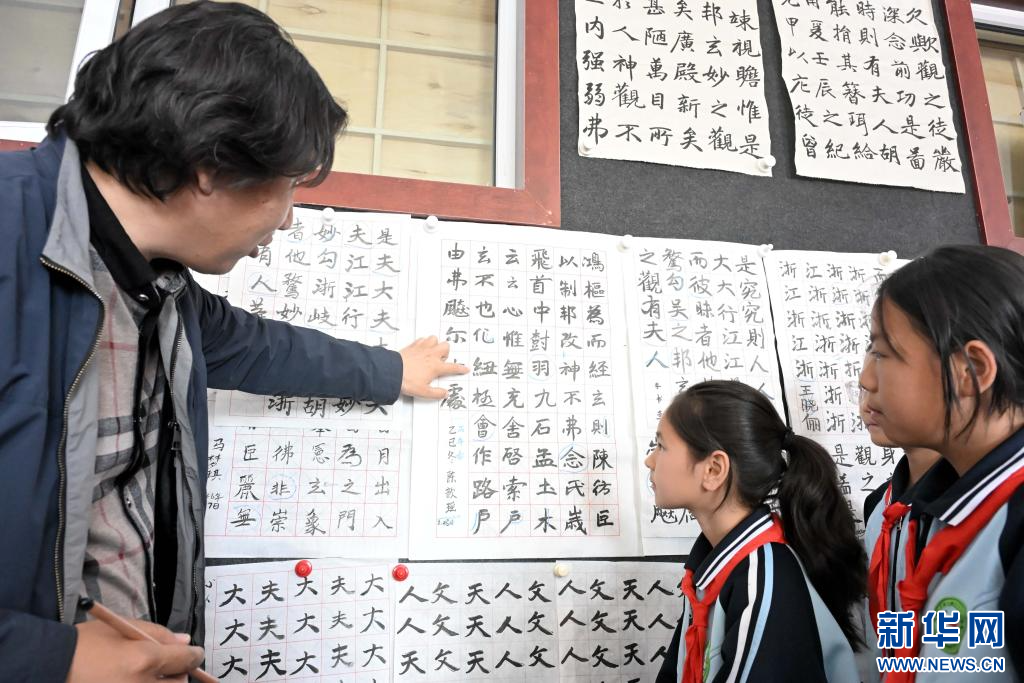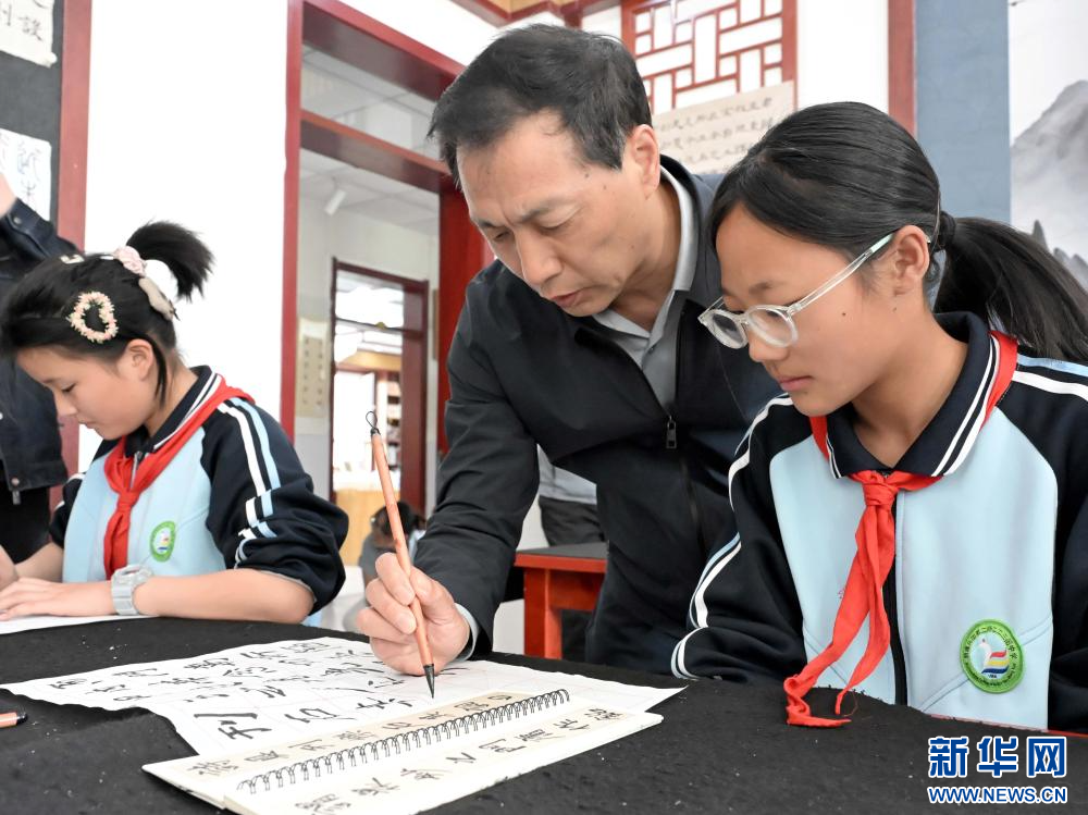 4月27日,书法家在新疆铁门关市开泽镇中学书法课堂上为孩子们进行技法示范。