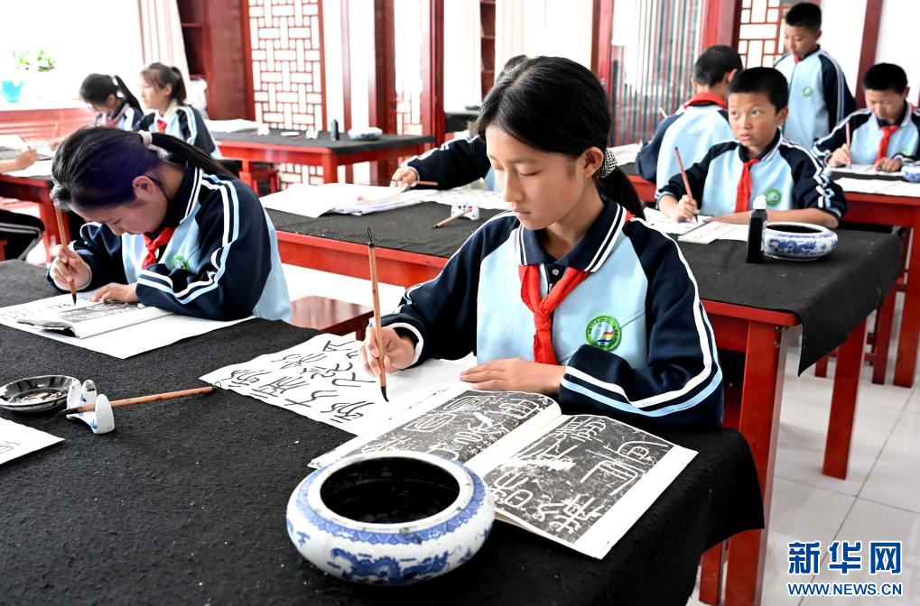 4月27日,新疆铁门关市开泽镇中学学生在书法课堂上练习书法。
