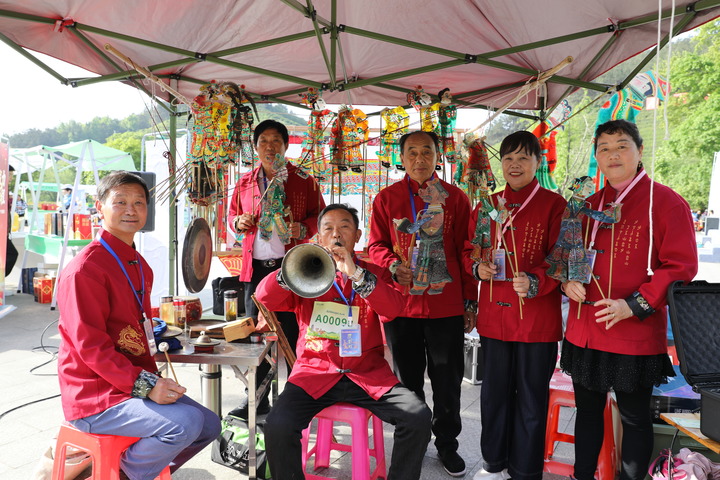 4月26日,光山皮影戏的演员们在活动现场合影留念。(范保燕 摄)