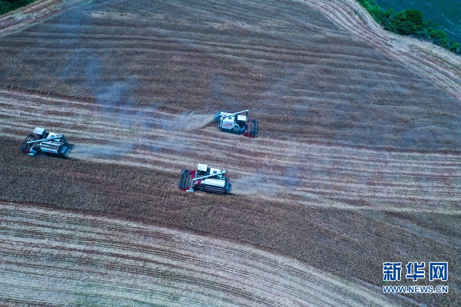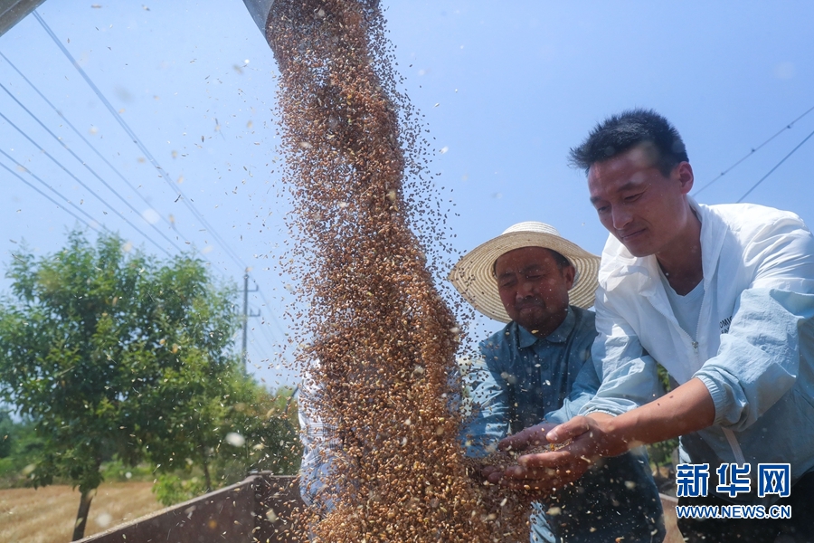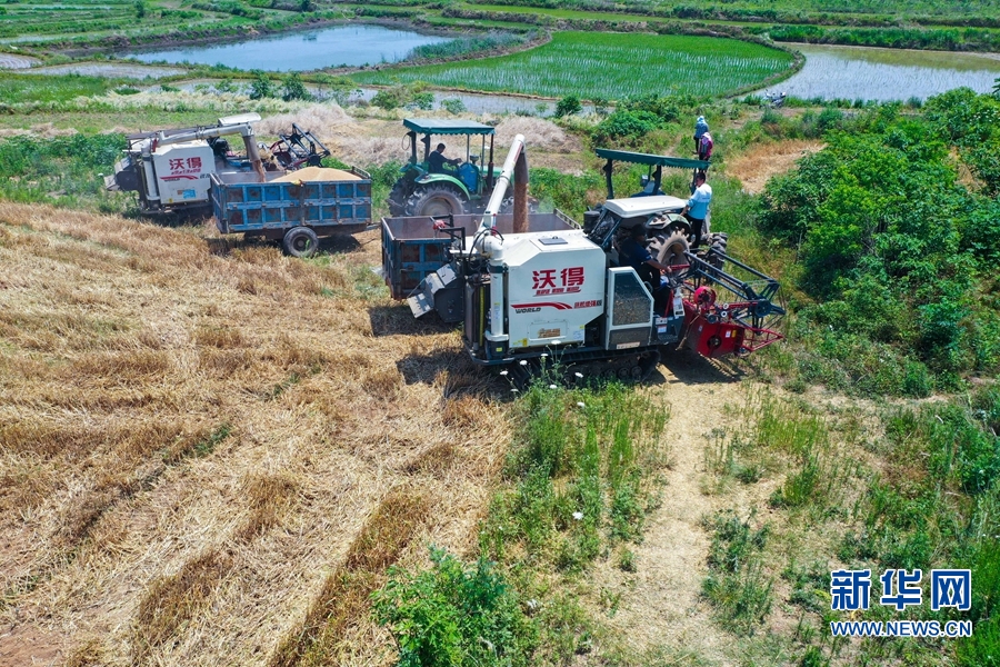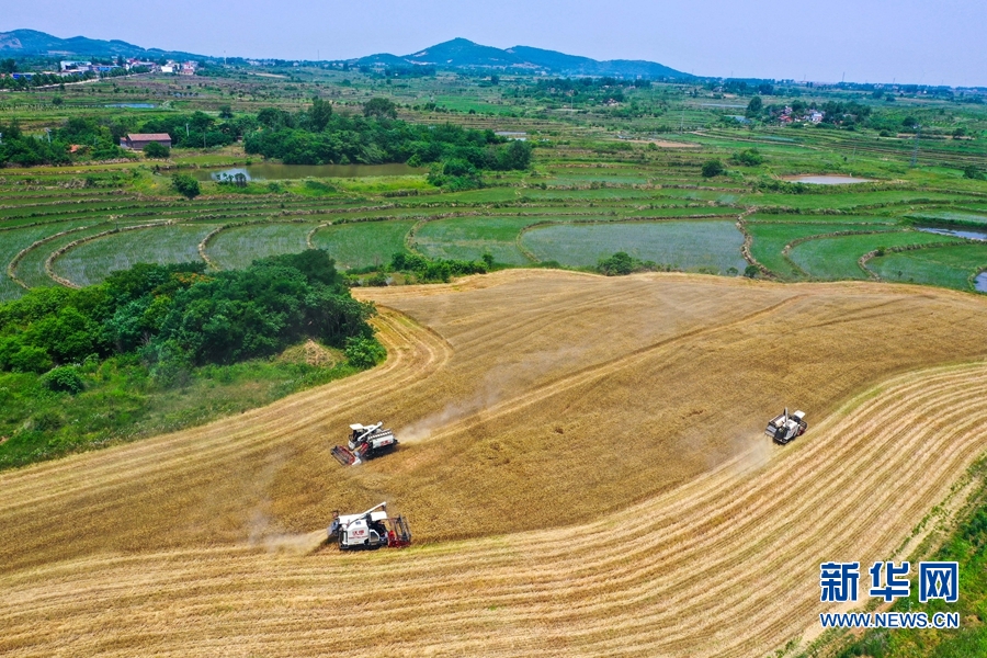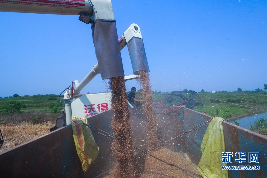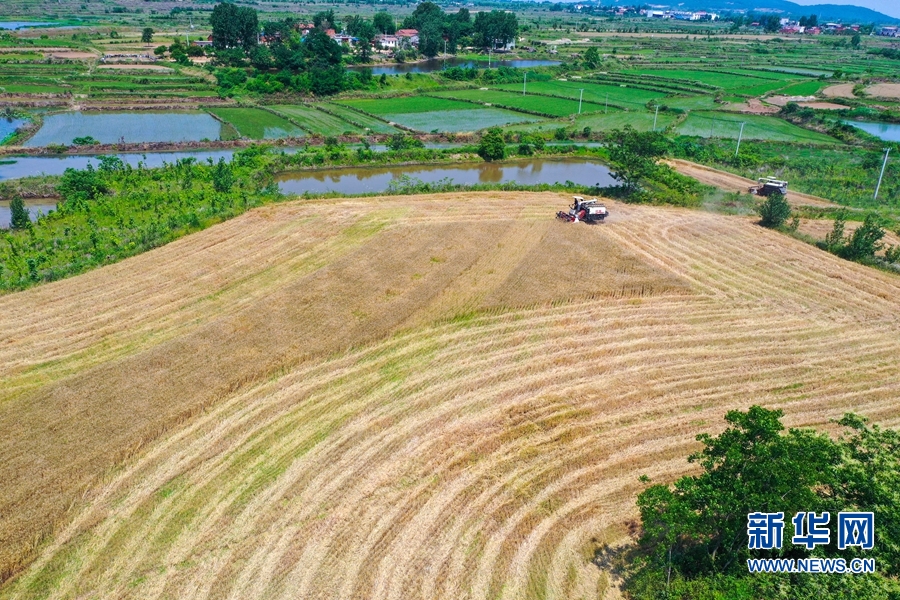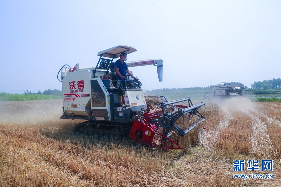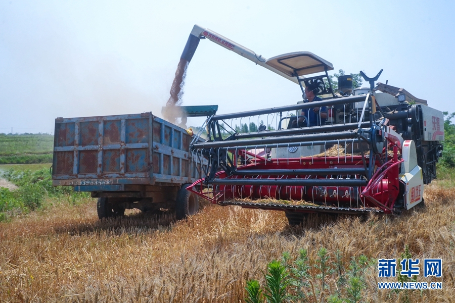 进入“三夏”,河南省信阳市光山县16万亩小麦喜获丰收。连日来,该县农业、农机等部门积极联系收割机等农机农具,帮助农民抢收小麦,确保小麦颗粒归仓。新华网发(谢万柏 摄)