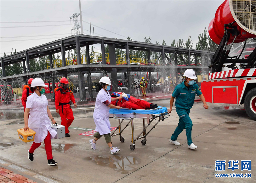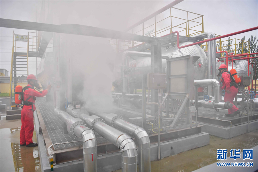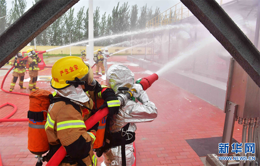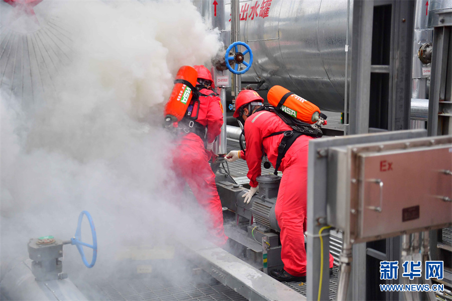 7月5日下午,中石化中原油田在卫11储气库注采站开展污水罐区泄漏着火事故应急演练。油田按照预案成立技术处置组、应急抢险组、应急资源协调组、安全保卫组、医疗救护组、综合处理组等,各司其职,通力配合,对着火罐体实施灭火、冷却降温,最终对泄漏点实施堵漏抢险作业,成功处置了一场“事故”,进一步提高了参战人员对油气泄漏、火灾、环境污染、人员中毒等突发事件的应急处置能力。新华网发(仝江 摄)