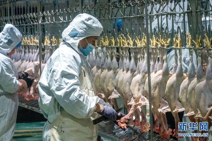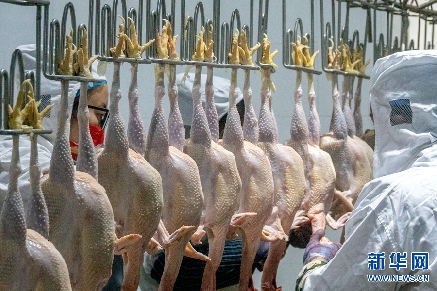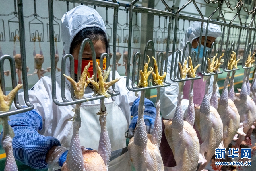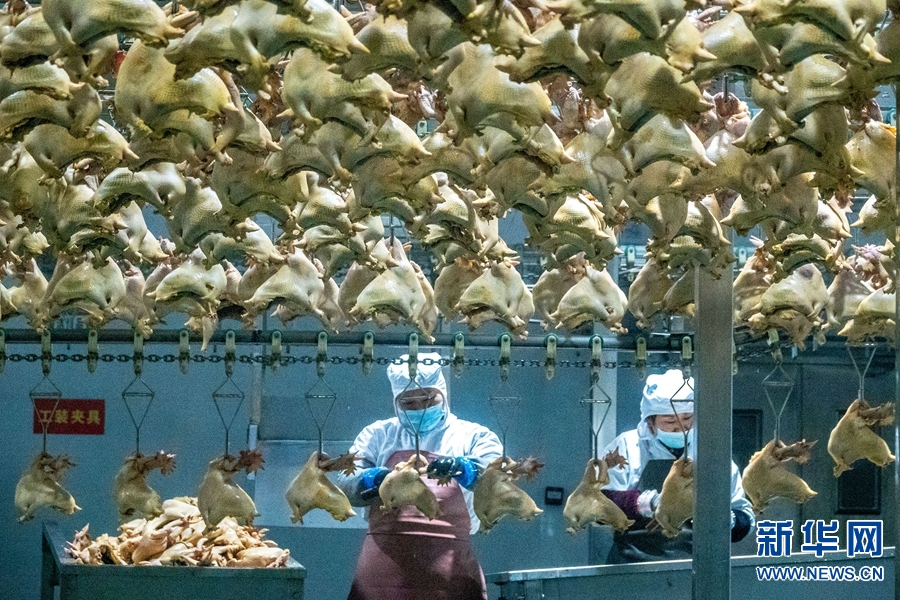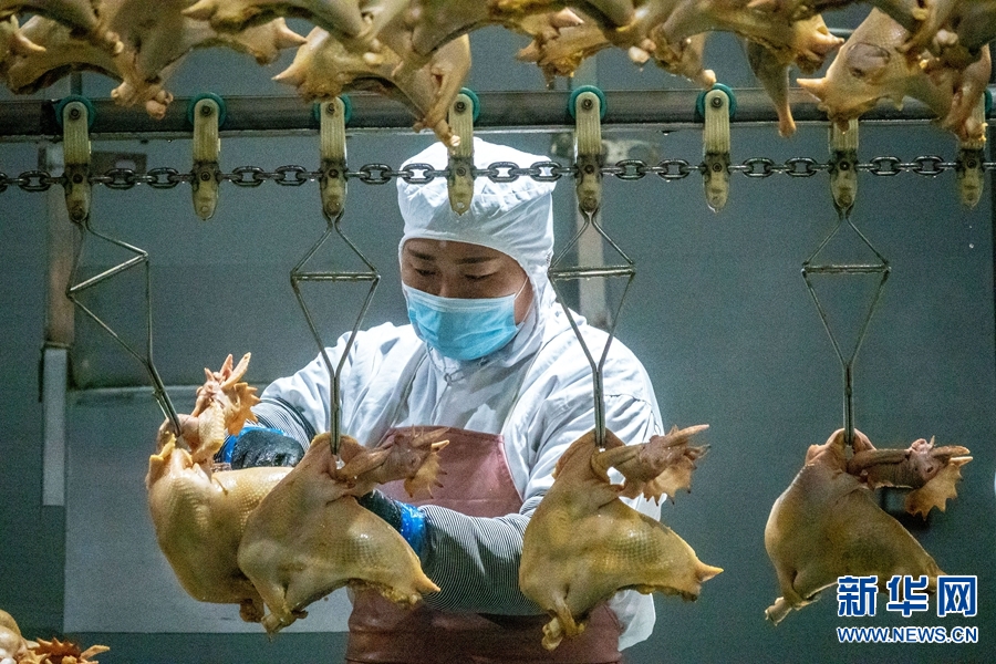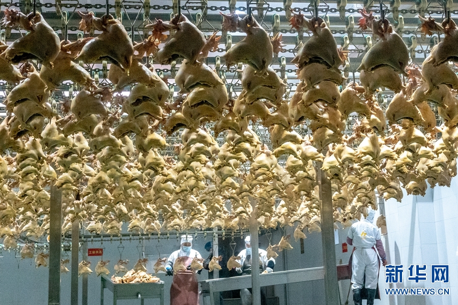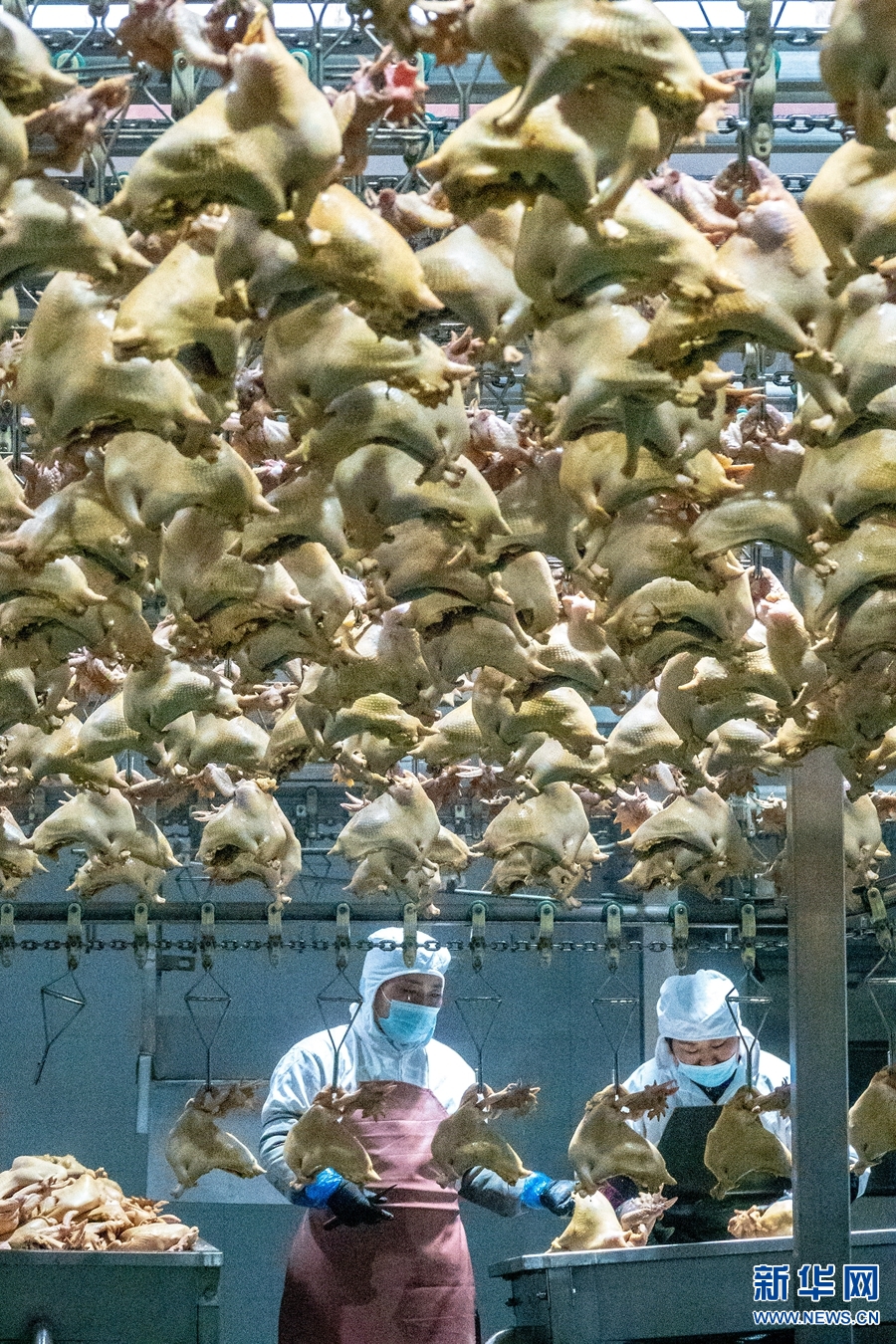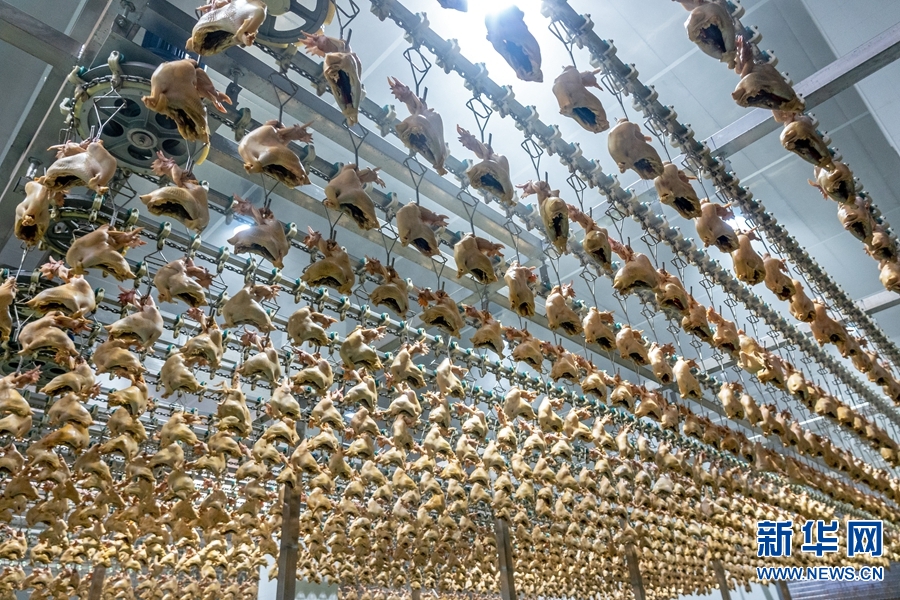 近年来,河南省滑县道口镇的烧鸡生产企业坚持走科技创新之路,把原来的“炸鸡”环节改为“非油炸”着色工艺,使烧鸡更环保、更可口,深受广大消费者的好评。新华网发(王子瑞 摄)