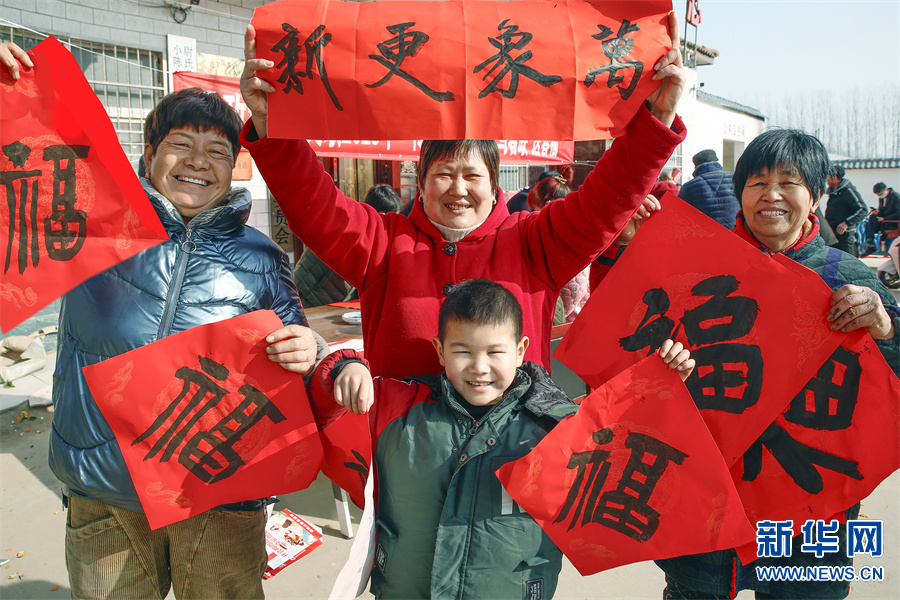 1月10日,河南省开封市尉氏县小陈乡大齐村,村民在展示收到的春联和福字。 新华网发(李新义 摄)