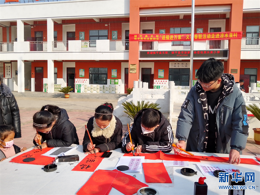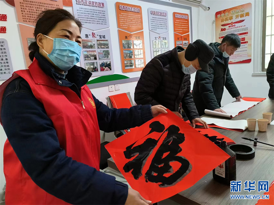 1月11日,河南省开封市尉氏县两湖办事处枣朱村,文艺志愿者在开展“迎新年 写春联 送春福 送温暖”志愿活动。新华网发(李新义 摄)