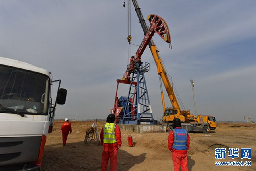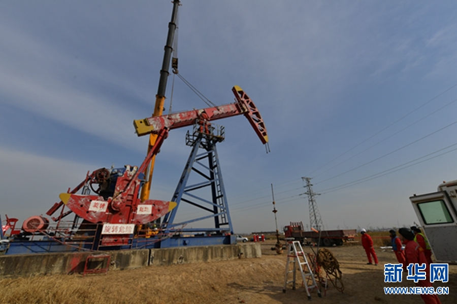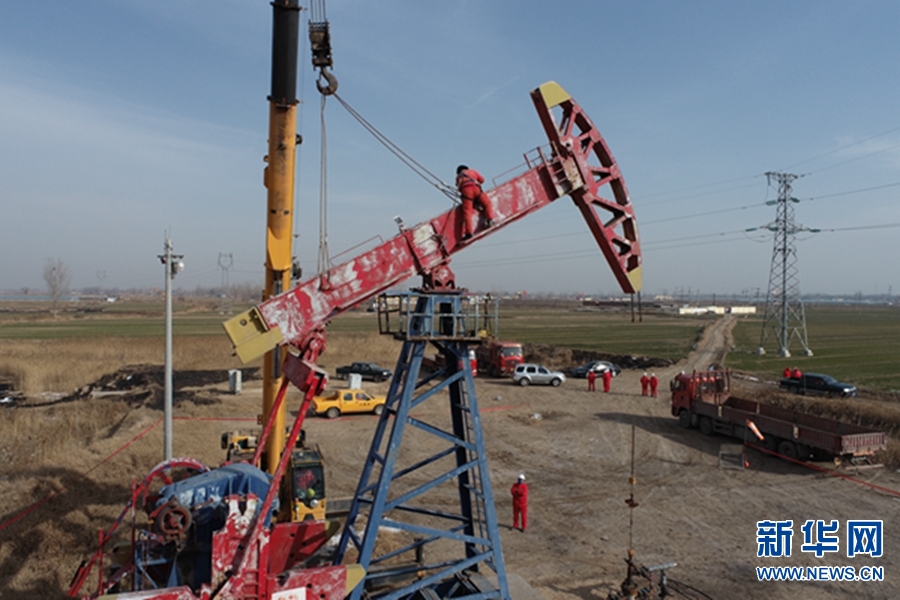 1月18日,中国石化中原油田地面工程抢维修中心文留工区文95-85井,职工在拆卸抽油机。