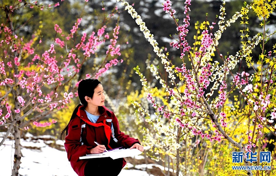 3月18日,河南省洛阳市汝阳县十八盘乡木庄村桃花园,一名学生在写生。