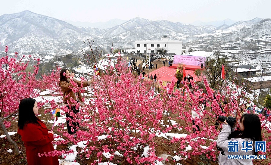 一场春雪过后,位于豫西山区的河南省洛阳市汝阳县十八盘乡木庄村举行桃花游园会,吸引了许多游客踏雪而来,赏花拍照。近年来,汝阳县充分利用自然资源,大力发展经济林种植,带动当地村民增收致富。新华网发(高山岳 李景堂 史丽娜 摄)