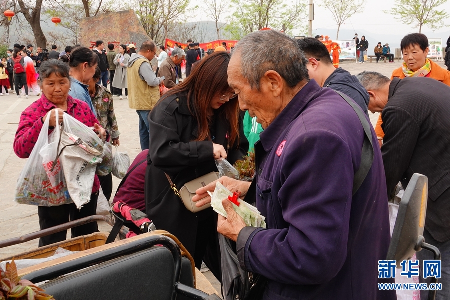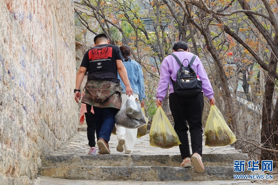 4月2日,河南省鹤壁市鹤山区姬家山乡王家辿村,游客带着刚刚采购的野生红油香椿而归。