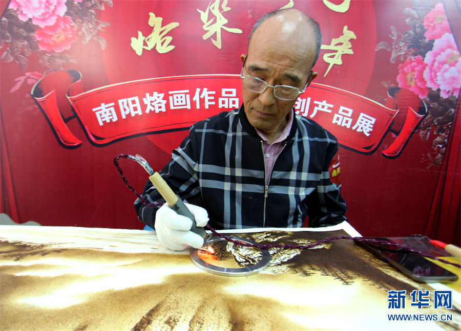 5月10日,河南省南阳市美术馆,南阳市烙画厂工艺美术师在创作烙画作品。
