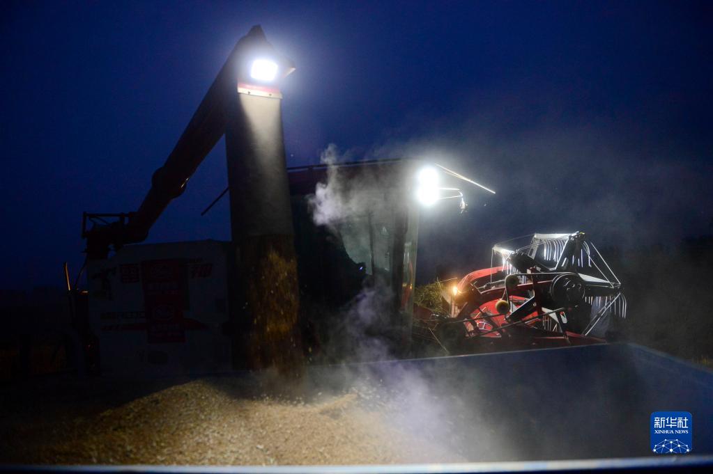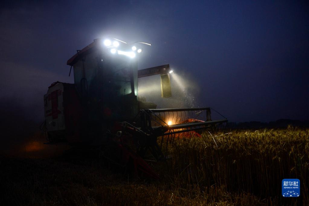 6月1日晚,在河南省驻马店市汝南县老君庙镇,农民操作收割机抢收小麦。新华社发(孙凯 摄)