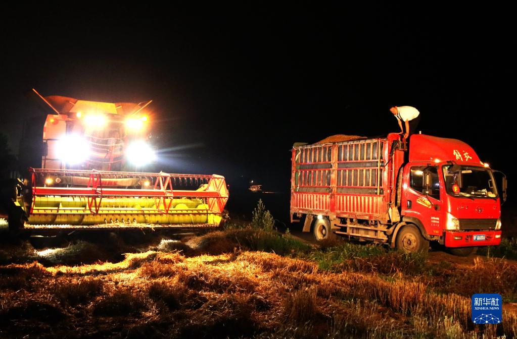 6月1日凌晨,大型收割机在河南省南阳市内乡县抢收小麦。新华社发(张中立 摄)