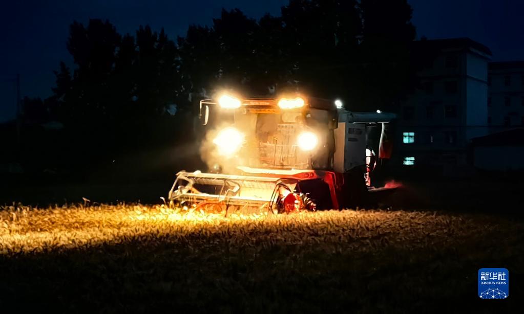 6月1日晚,大型收割机在河南省驻马店市汝南县老君庙镇抢收小麦。新华社发(孙凯 摄)