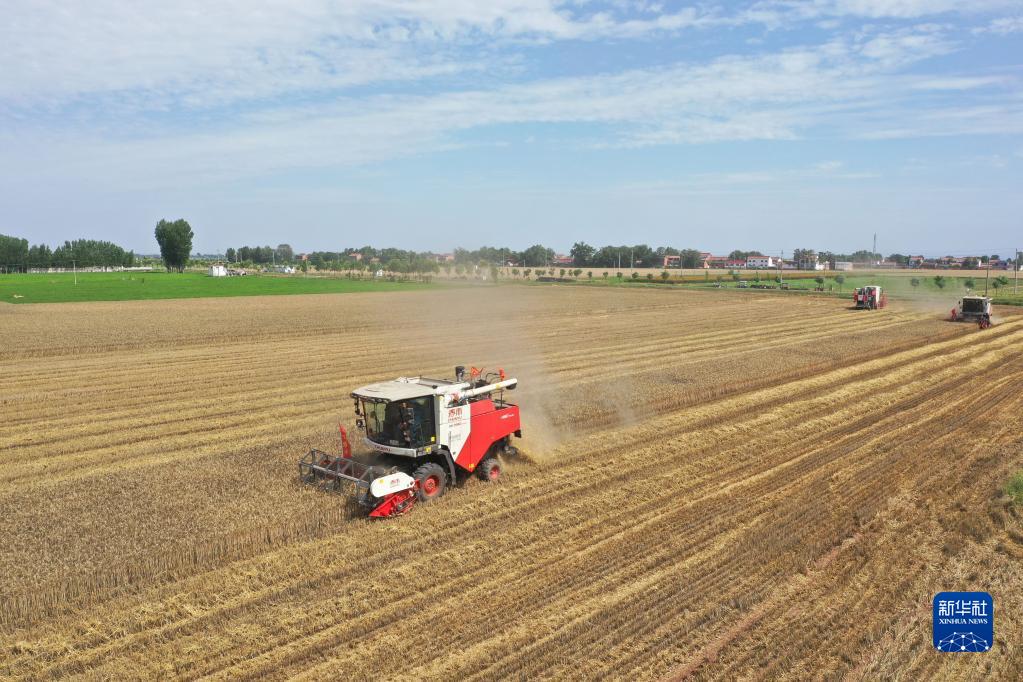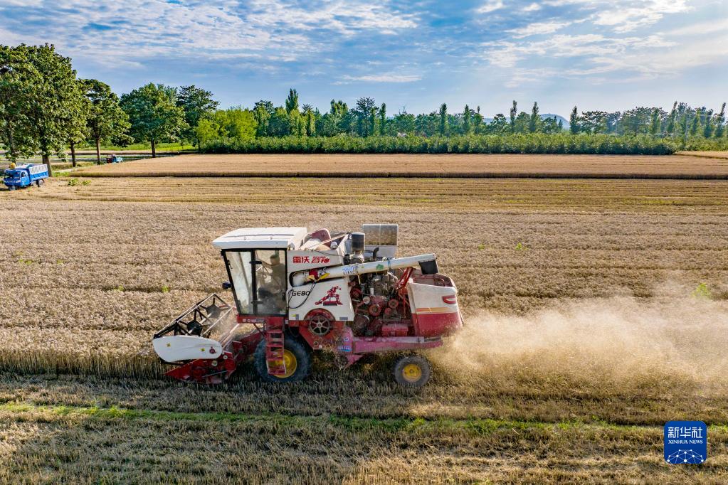 6月1日,河南省焦作市温县武德镇徐堡村村民驾驶收割机在田间收小麦(无人机照片)。新华社发(徐宏星 摄)