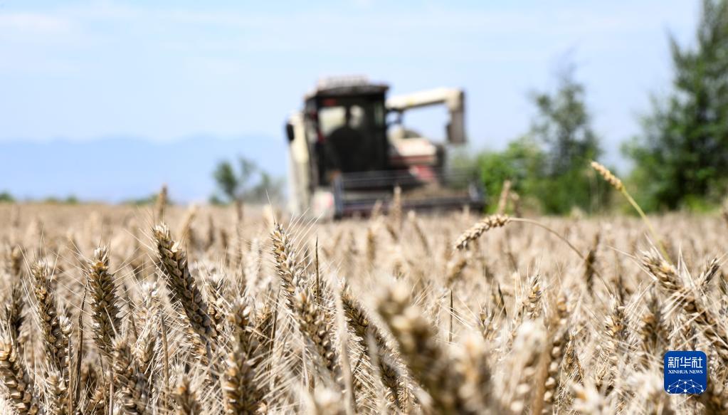 6月1日,在河南省济源市轵城镇洪沟村,农民驾驶联合收割机在抢收小麦。新华社发(苗秋闹 摄)