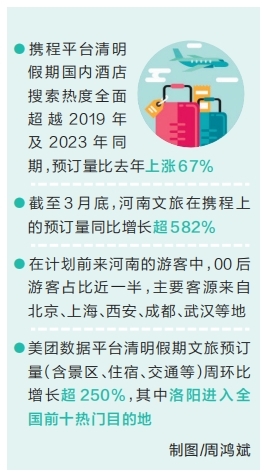 清明小长假即将开启,4月2日,记者从携程获悉,清明假期该平台国内酒店搜索热度全面超越2019年及2023年同期,预订量比去年上涨67%。其中,截至3月底,河南文旅在携程上的预订量同比增长超582%,位列清明假期全国热门出行目的省份第7名。在计划前来河南的游客中,00后游客占比近一半,主要客源来自北京、上海、西安、成都、武汉等地。此外,美团数据也显示,截至4月2日,该平台清明假期文旅预订量(含景区、住宿、交通等)周环比增长超250%,其中河南洛阳进入全国前十热门目的地。