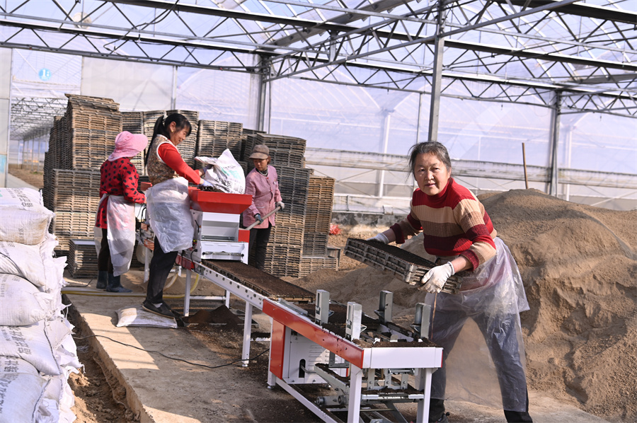 3月20日,新县吴陈河镇章敦村万疆丰农业种植示范基地育秧车间,工人在工作。