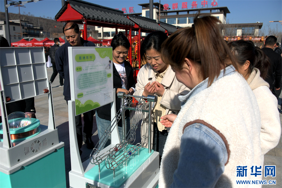 3月20日,洛阳嵩县,群众在体验科技小实验。