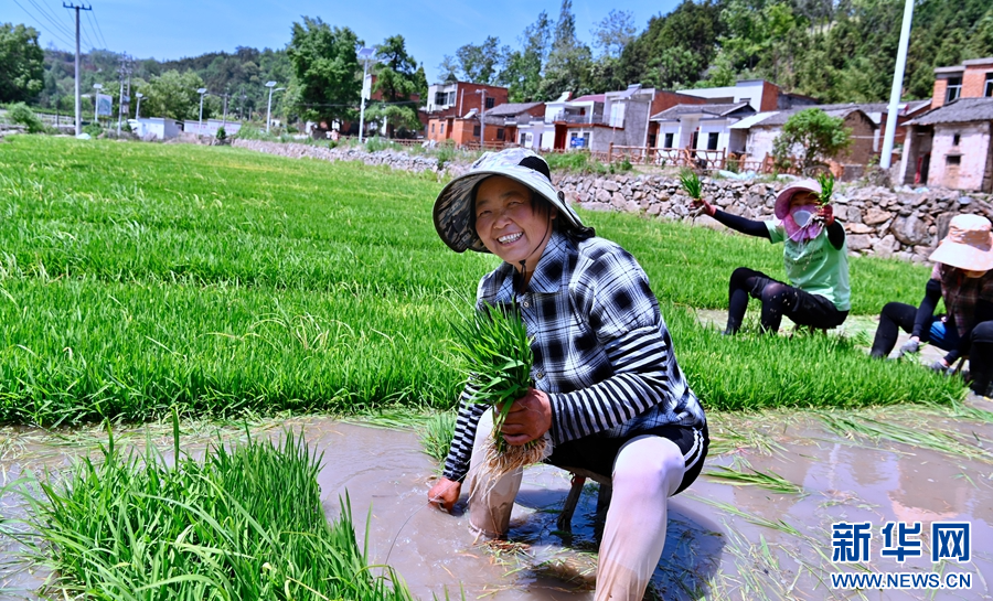 5月7日,河南新县陡山河乡,农民在田间拔秧。