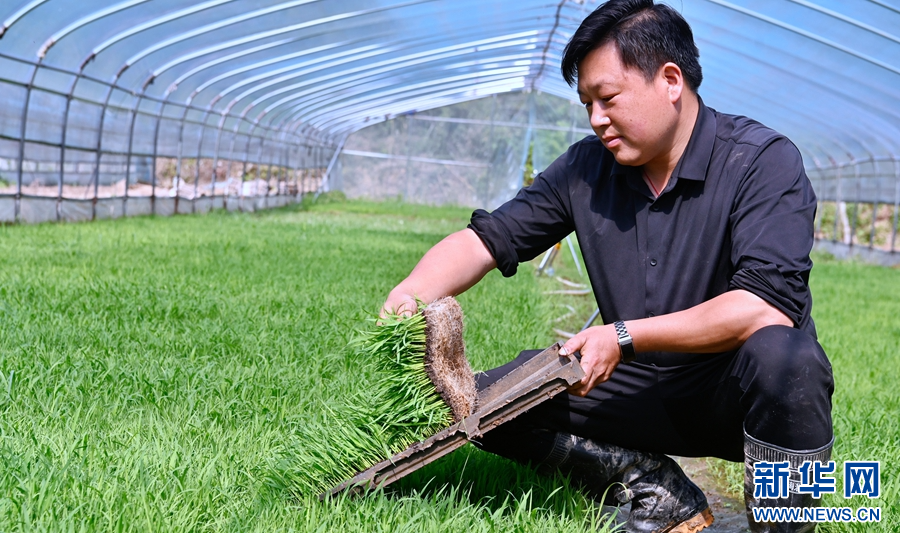 5月7日,河南新县陡山河乡,种植户在查看秧苗生长情况。