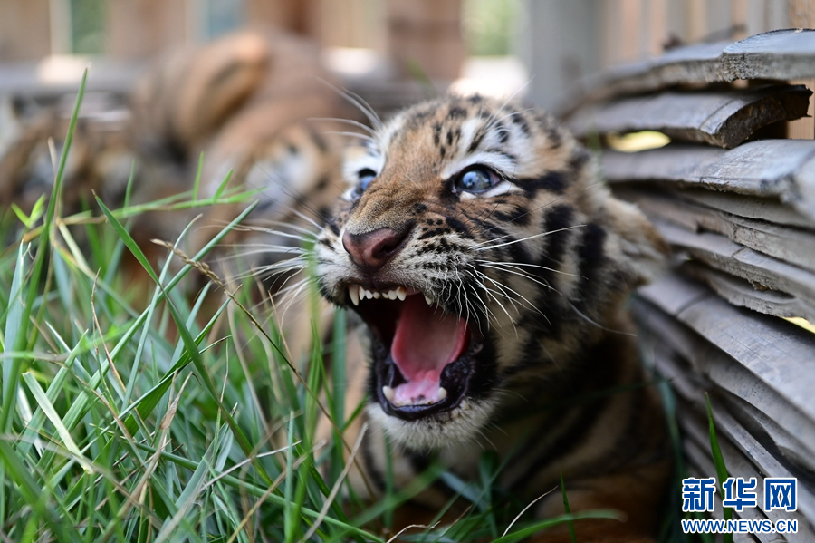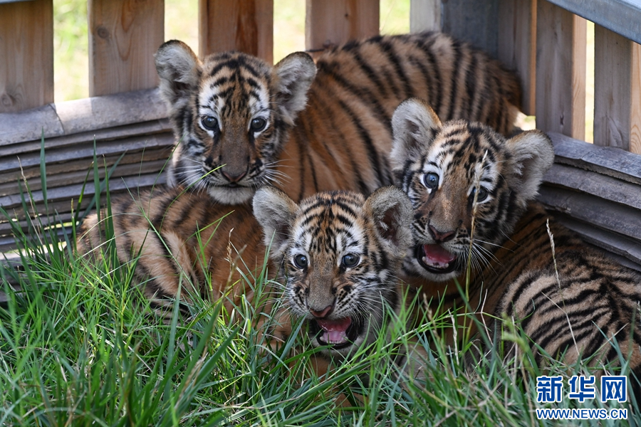 7月29日,在河南省沁阳市和生森林动物乐园老虎散养区拍摄的小东北虎三胞胎。