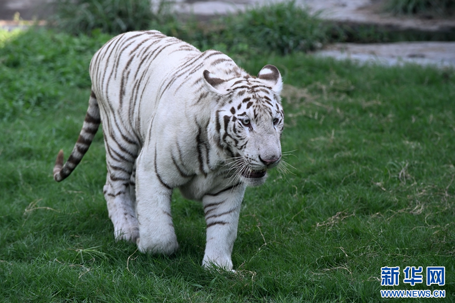 7月29日,在河南省沁阳市和生森林动物乐园老虎散养区拍摄的白虎。