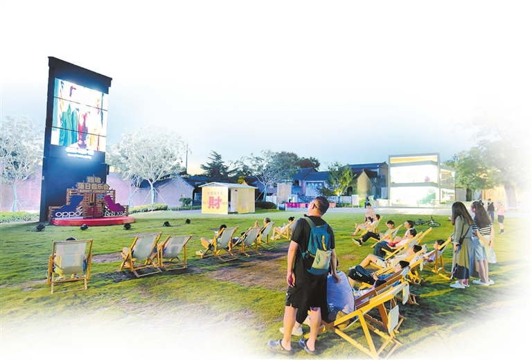 在洛阳市孟津区魏坡·新序,游人在草坪上看电影。郑占波 摄