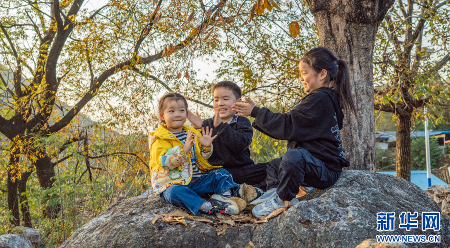 在内乡县吴垭石头村,孩童在石墩上嬉戏。韩阳 摄