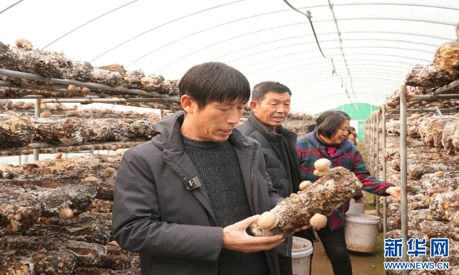 11月16日,在南阳市桐柏县程湾镇艾庄村一处香菇种植基地,农户们正在查看香菇长势。高阳 摄