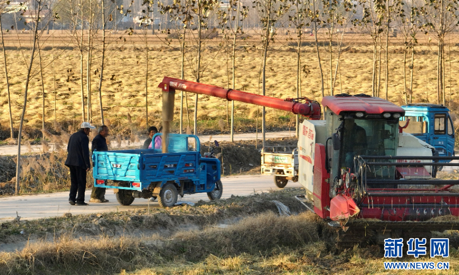 11月20日,收割机在濮阳市范县辛庄镇的稻田里收获稻谷(无人机照片)。李博 摄