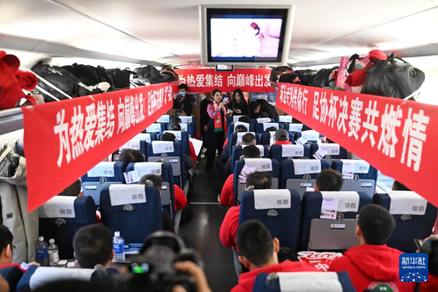 12月6日,G1801次列车乘务员在与河南俱乐部酒祖杜康队球迷互动。新华社记者 李嘉南 摄