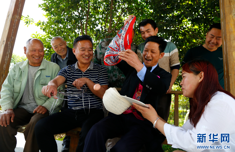 在河南宝丰县赵庄镇大黄村,农民魔术师毛新强(前左二)和张本洲(前左三)在切磋魔术技艺。