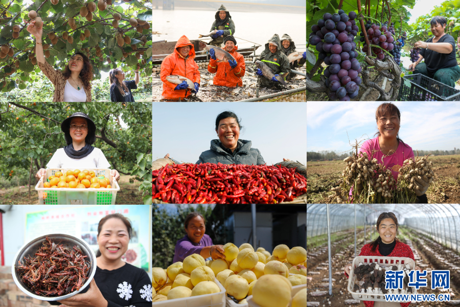 河南省宝丰县村民在展示收获的各类农作物(拼版照片)。