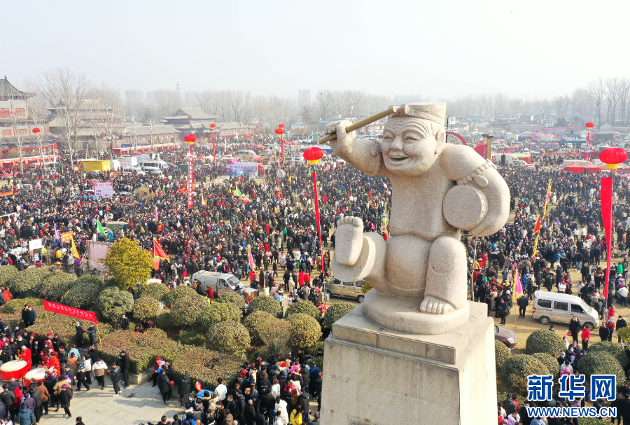 2020年12月27日,民间艺人在河南省平顶山市宝丰县张八桥镇姚店铺村表演经担舞(无人机照片)。