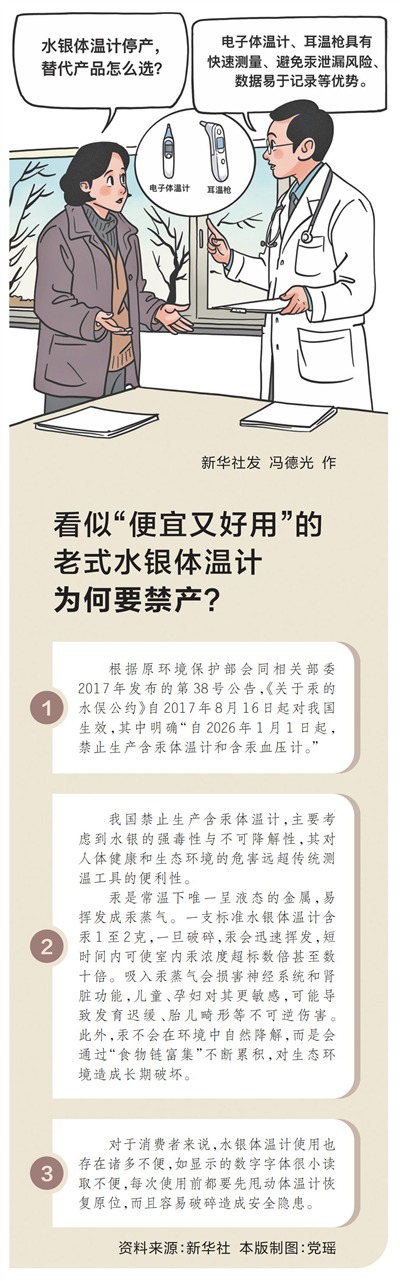 “水银体温计停产是国际趋势,也是中国汞污染防治的重要一步。”李源表示,家中若仍有水银体温计可继续使用,但须妥善保管、防止破碎;若无,电子体温计完全可胜任日常需求。